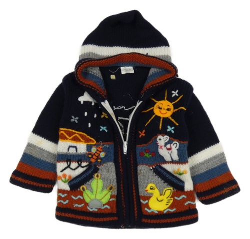 Tmavomodro-farebný prepínaci sveter s obrázkami a kapucňou