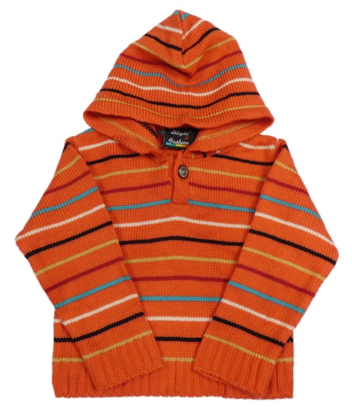 Tmavooranžovo-farebný pruhovaný pletený sveter s kapucňou