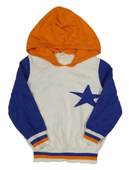 Bielo-safírovo-oranžový úpletový sveter s hviezdičkami a pruhmi a kapucňou