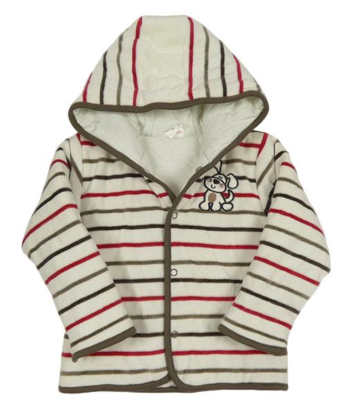 Smetanovo-hnedo-červená pruhovaná zamatová zateplená prepínaci mikina so psem a kapucňou