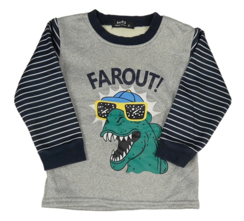 Sivo-tmavomdro-biela melírovaná pruhovaná tepláková mikina s dinosaurom