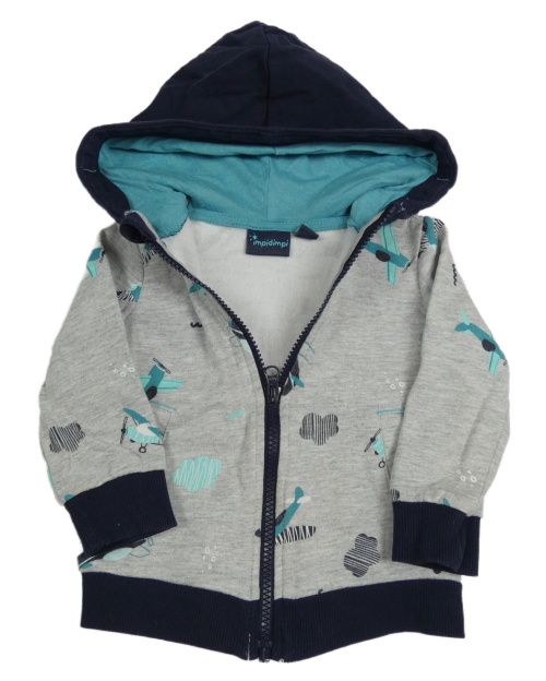 Sivo-tmavomodrá melírovaná prepínaci mikina s lietadly a obíláčky a kapucňou impidimpi