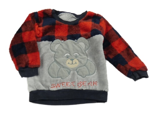 Tmavomodro-červeno-sivá plyšová mikina s medvedíkom