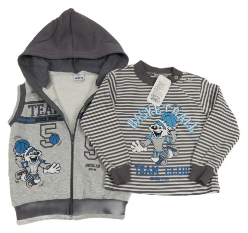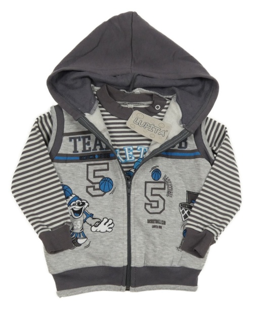 • Nové - 2Set - Sivo-tmavosivá melírované prepínaci tepláková tepláková vesta so zvieratkom a nápismi a kapucí + pruhované mikinotriko LUPITA