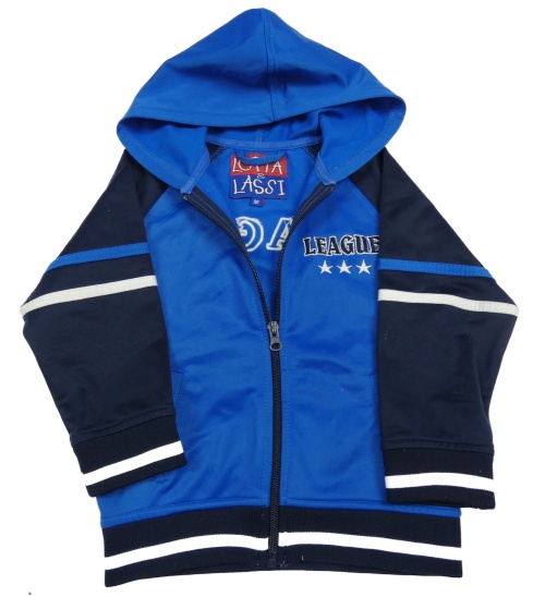 Modro-tmavomodrá športová prepínaci mikina s nápisom a kapucňou