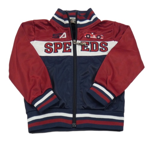 Modro-červeno-biela športová prepínaci mikina s nápismi a autom