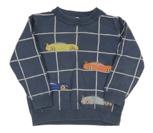 Tmavomodrošedo-biely kockovaný sveter s autami M&S