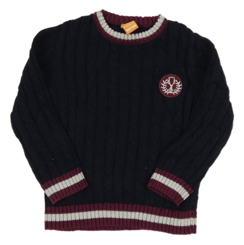 Tmavomodrý vzorovaný sveter s vínovým lemem a nášivkou