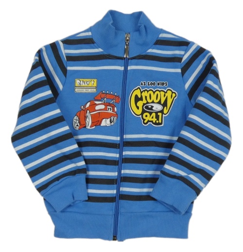 Modro-čierno-biela pruhovaná prepínaci mikina s autom a nápisom
