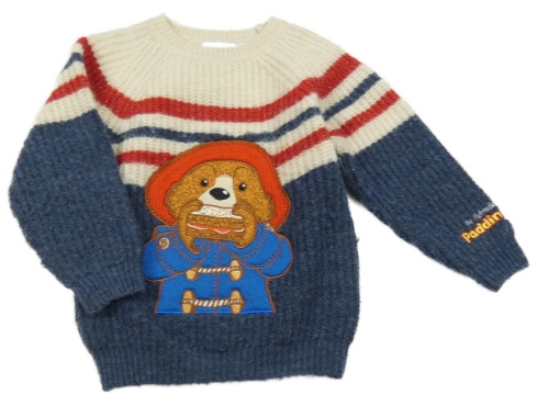 Tmavmodro-béžový vlnený sveter s Paddingtonem Tu