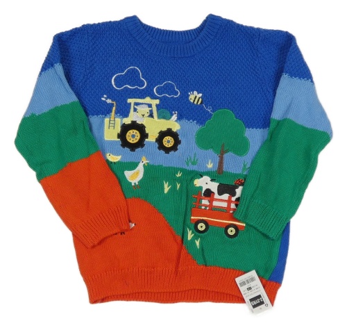 Nové - Modro-zeleno-červený sveter s traktorom a zvířaty Dunnes
