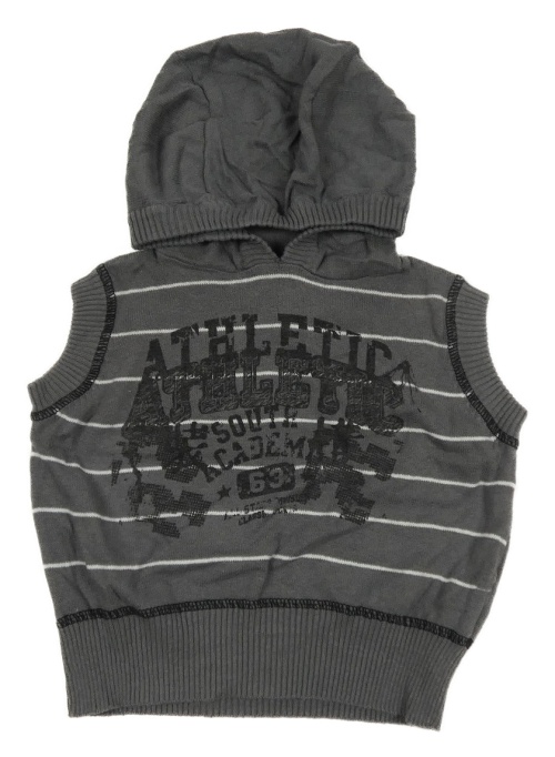 Sivá pruhovaná svetrová vesta s nápisom a kapucňou