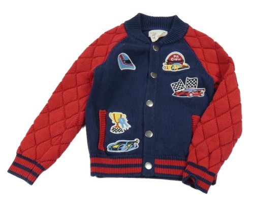 Tmavomodro-červený prepínaci sveter s nášivkami Rorie Whelan