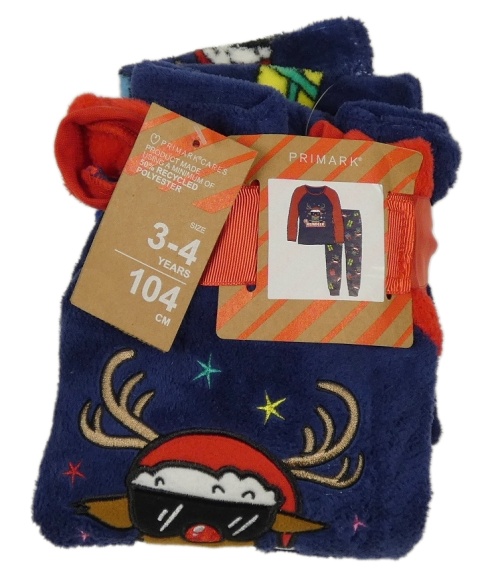 Nové - tmavomodro-červené plyšové vianočné pyžama so sobmi a darčekmi PRIMARK