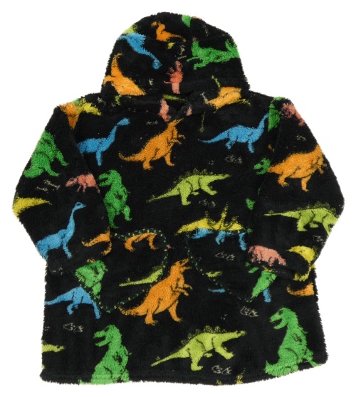 Čierna huňatá oversize mikina s dinosaurami a kapucňou