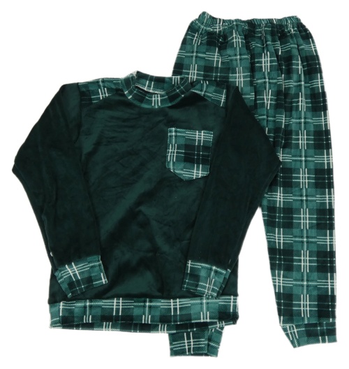 Tmavozeleno-biele plyšové pyžama s vreckom