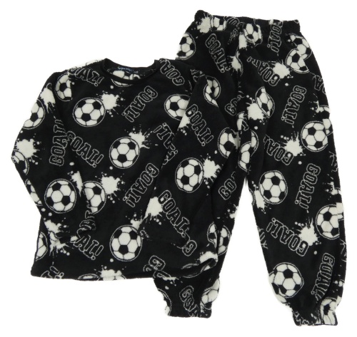 Čierne plyšové pyžama s loptami a nápismi a bílými skvrnkami