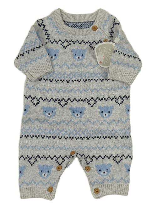 Nový - sivo-modro-tmavomodrý vzorovaný pletený overal s medvedíkmi little nutmeg