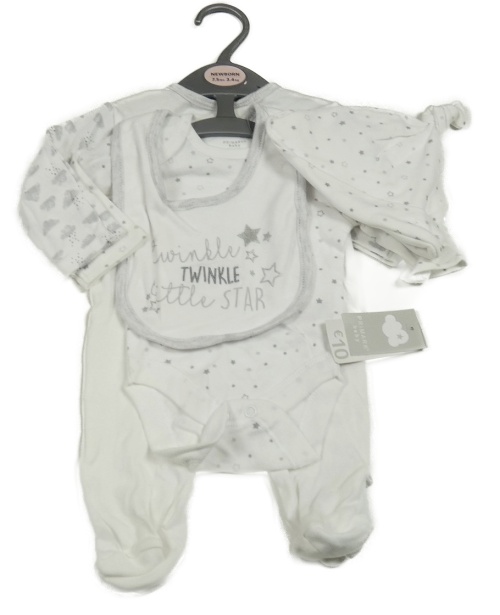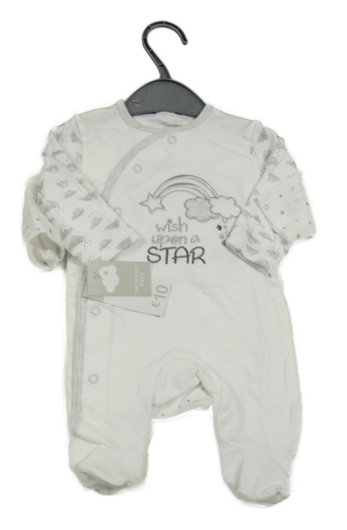 4set - biely overal s nápisom a duhou + bielo-sivé body s hvězdami + bryndák + čapica Primark