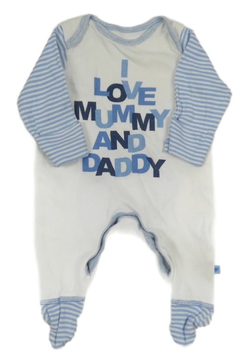 Bielo-modrý pruhovaný overal s nápismi Mothercare