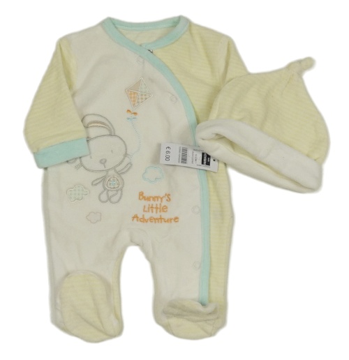 Nové - 2set- bielo-žltý pruhovaný zamatový overal s králíčkem+ čapica Dunnes