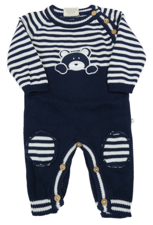 Tmavomodro-biely pletený overal s pruhmi a medvěďom