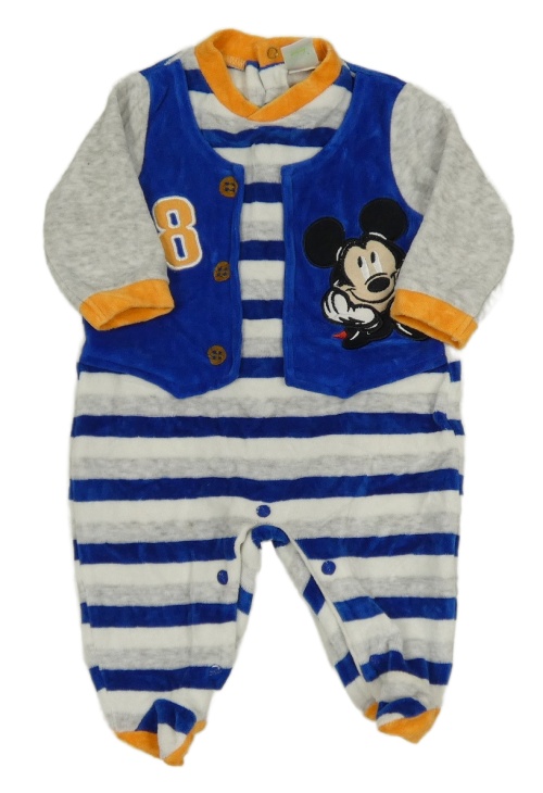 Sivo-modro-biely pruhovaný zamatový overal s Mickeym a sakem Disney
