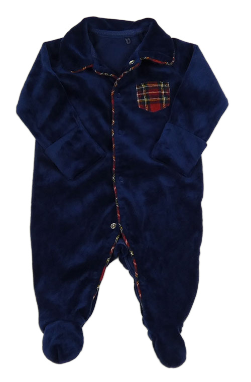 Tmavomodrý plyšový overal s kockovanou vreckom a golierikom Tu