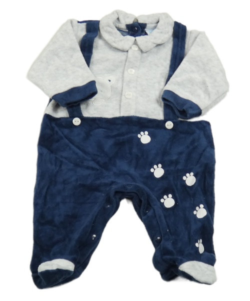 Tmavomodro-svetlosivý zamatový overal s medvedíkom a tlapkami a golierikom