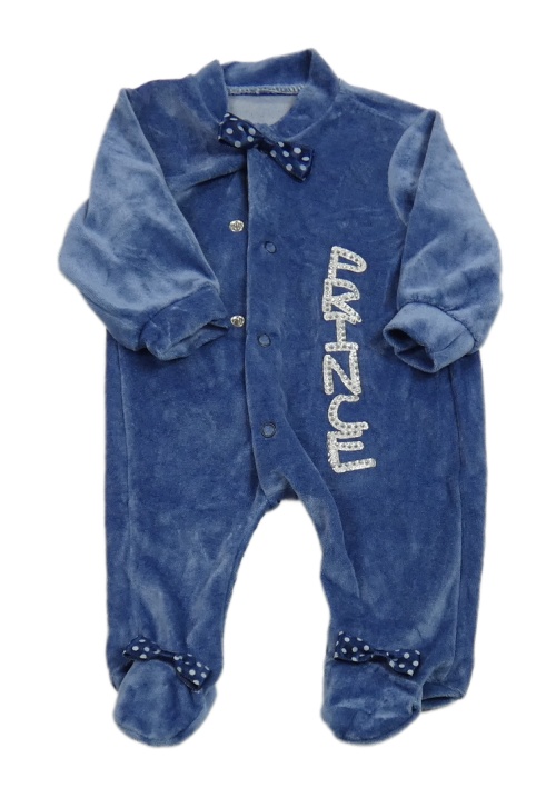 Tmavomodrý zamatový overal s nápisom a mašľami