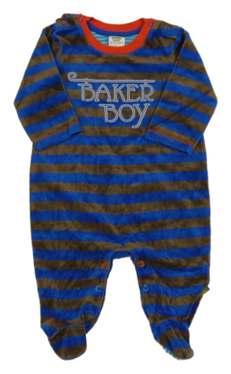 Hnedo-modrý pruhovaný zamatový overal s nápisom baker