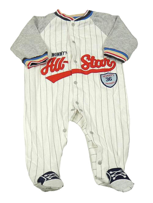Bielo-sivý pruhovaný overal s nápisom a nášivkou