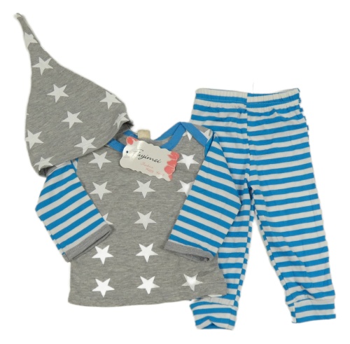 2set - Sivo-bielo-modré pyžama s pruhmi a hvězdami + čapica s hviezdami