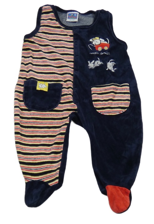 Tmavomodro-žluto-červené pruhované sametové dupačky Topolino