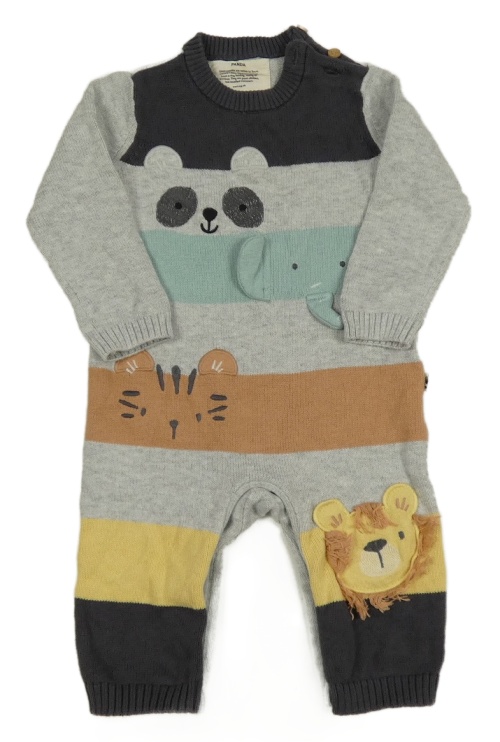 Sivo-farebný pruhovaný pletený overal so zvířaty F&F