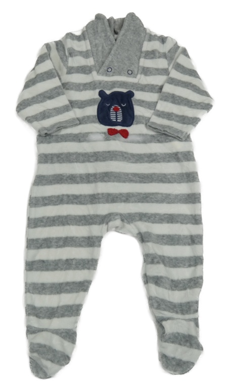 Bielo-sivý pruhovaný zamatový overal s medvedíkom Obaibi