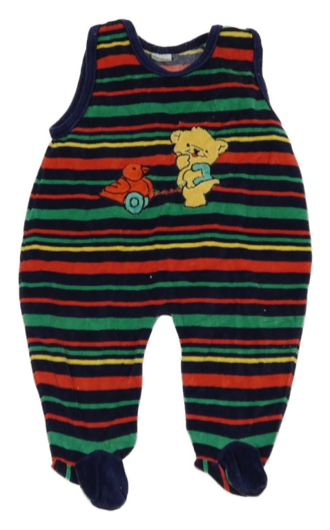 Tmavomodro-zeleno-červené pruhované sametové dupačky s medvěďom