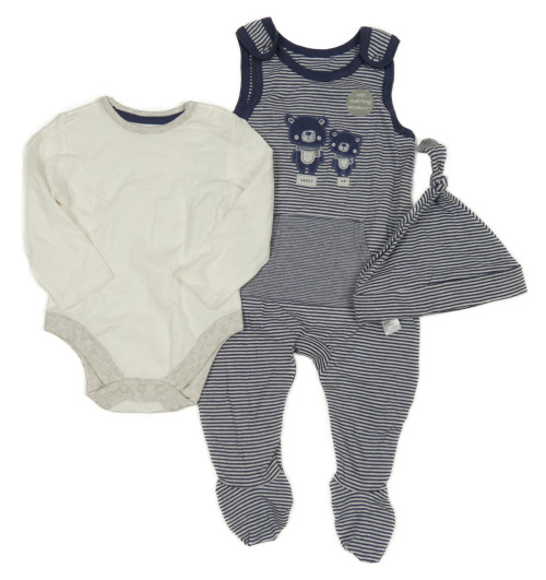 Nové - 3Set - tmavomodro-bílé pruhované dupačky s medvedíkmi a kapsou + čepice + bílo/šedé body George