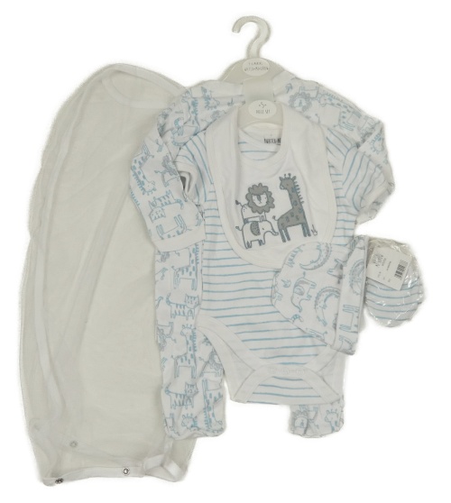 Nové - 5 set - bielo-modrý overal s dinosaury + pruhované body + bryndák + čepice + rukavice