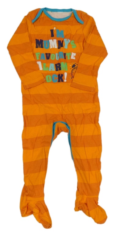 Oranžový pruhovaný overal s nápisom a budíkem