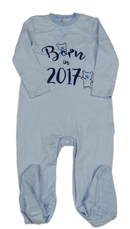 Světlemodro-biely pruhovaný overal s nápisom a medvedíkmi F&F