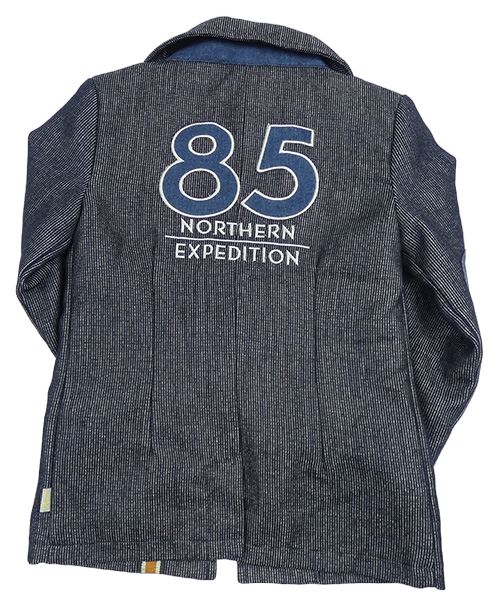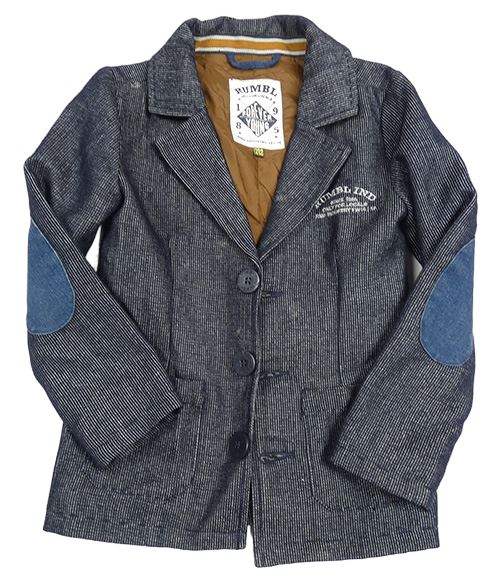 Tmavomodré menšestrové sako s logom a číslom RUMBL