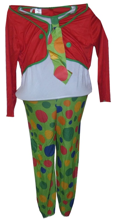 Kockovaným - Červeno-bielo-zelený overal s bodkovaná ými nohavice a kravatou - klaun