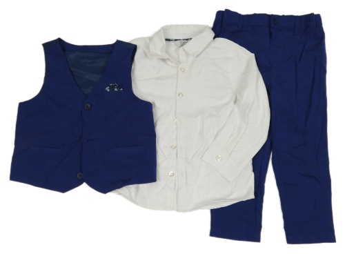 košile - bavlna + polyester, kalhoty - v pase nastavitelná guma, falešné kapsy, vesta - falešné kapsy