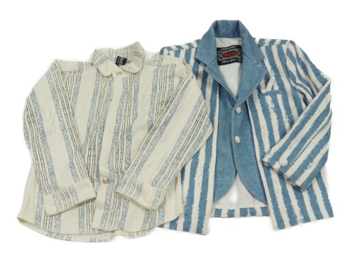 3Set - Modro/bílé pruhované sako so všitou vestou + motýlek + bílo/modro/černá pruhovaná košeľa Mintu
