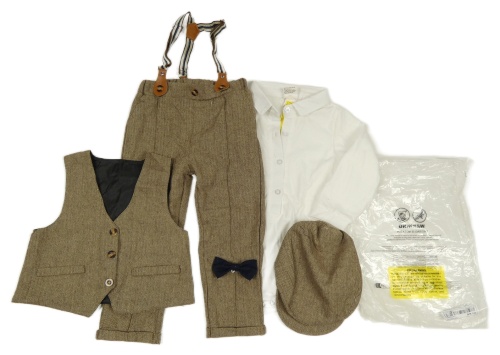 -Nové 5set- Béžové vzorované nohavice s kšandami+ vesta+ biele body+ bekovka+ motýlok