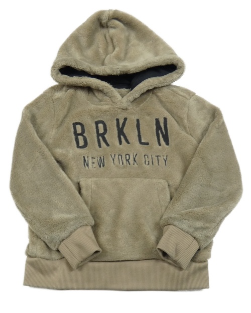 Hnedošedé á plyšová mikina s nápismi a vreckom a kapucňou