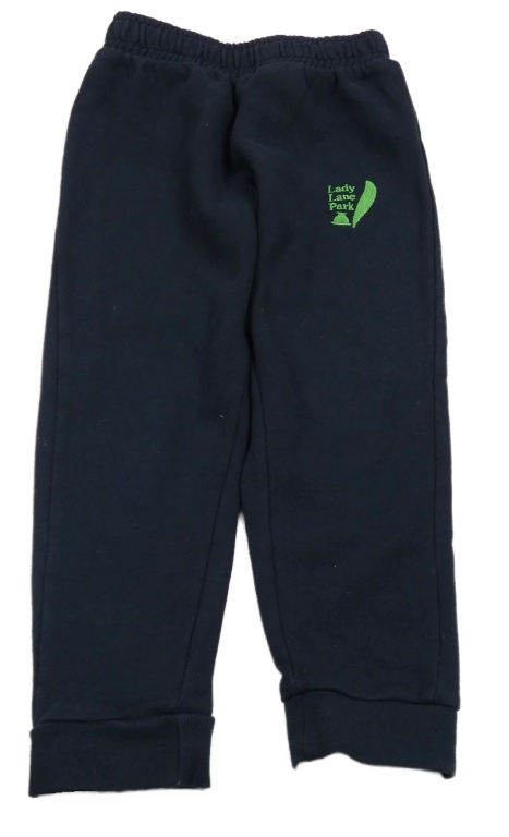 Tmavomodré tepláky so zeleným vyšitým nápisom
