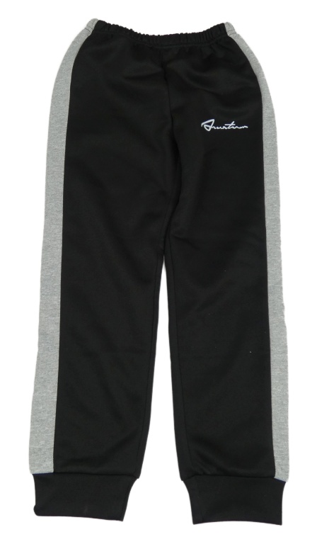 Čierno-sivé športové tepláky s pruhmi a nápisom