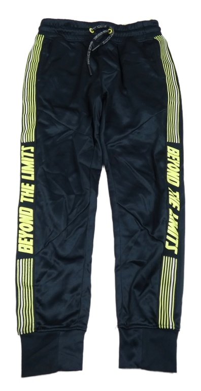 Tmavomodré športové tepláky s pruhmi a nápisom